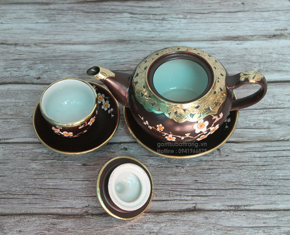 Men nâu là một trong số các loại men được sử dụng đầu tiên ở Bát Tràng, trải qua quá trình phát triển lâu dài, hiện nay men nâu đã được chuyển sắc thành một loại men bóng có tên là men da lươn. Phủ lên mình lớp men da lươn, bộ ấm chén Bát Tràng trông thật nổi bật với điểm nhấn là lớp đồng vàng được bọc xung quanh viền.