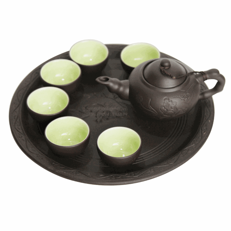 Màu men đen bóng đơn giản nhưng vô cùng trang nhã, bao gồm 1 ấm, 6 chén và 1 khay hình tròn. Nắp ấm và đường viền miệng ấm được thiết kế vừa khít, nước rơi trển nắp ấm cũng thể lọt được vào ấm. Vòi ấm được thiết kế dáng trúc với đường cong tự nhiên vươn lên từ thân như biểu tượng của sự sinh sôi, phát triển.