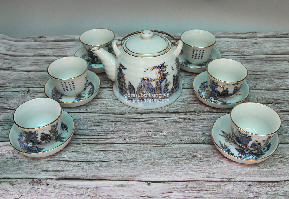 Nổi bật trên nền bộ ấm chén cao cấp là hình ảnh Trúc Lâm Thất Hiền được vẽ tay điêu luyện và viền vàng thật lấp lánh, kiêu sa